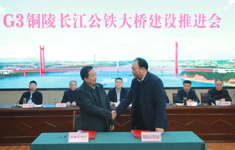 會上,中鐵大橋局與銅陵市交投集團舉行了G3銅陵長江公鐵大橋施工合同簽約儀式。