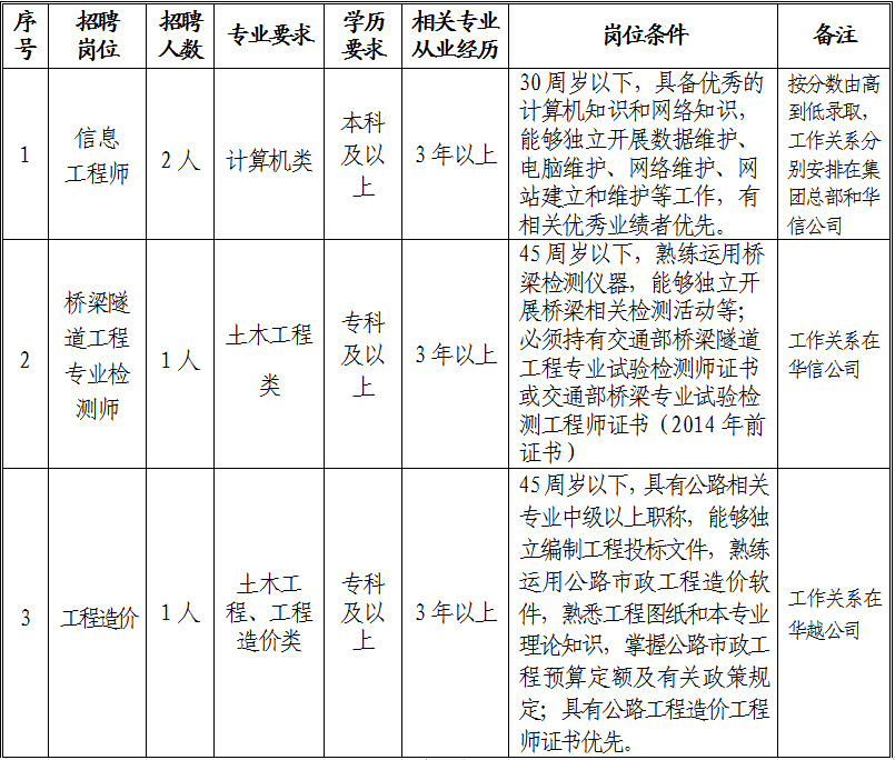 2.報名方式:采取網上投遞簡歷方式報名,凡有意應聘上述招聘崗位且符合崗位要求的人員,請將報名表、個人簡歷、有關證件掃描件(學歷證書、職稱證書、職(執)業證書、身份證等)發至報名郵箱:4060356@qq.com,或郵寄地址:銅陵市北京北斗星城3-C6C7棟1102號(銅陵市綜合交通投資集團有限公司收)。