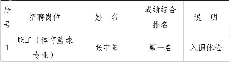 根據《銅陵市綜合交通投資集團有限公司公開招聘人員公告》和面試綜合成績排名,結合公司崗位實際需求和面試評審專家綜合意見,我公司經研究決定,本次招錄一名職工(體育籃球專業)。現將入圍體檢人員名單公示如下: